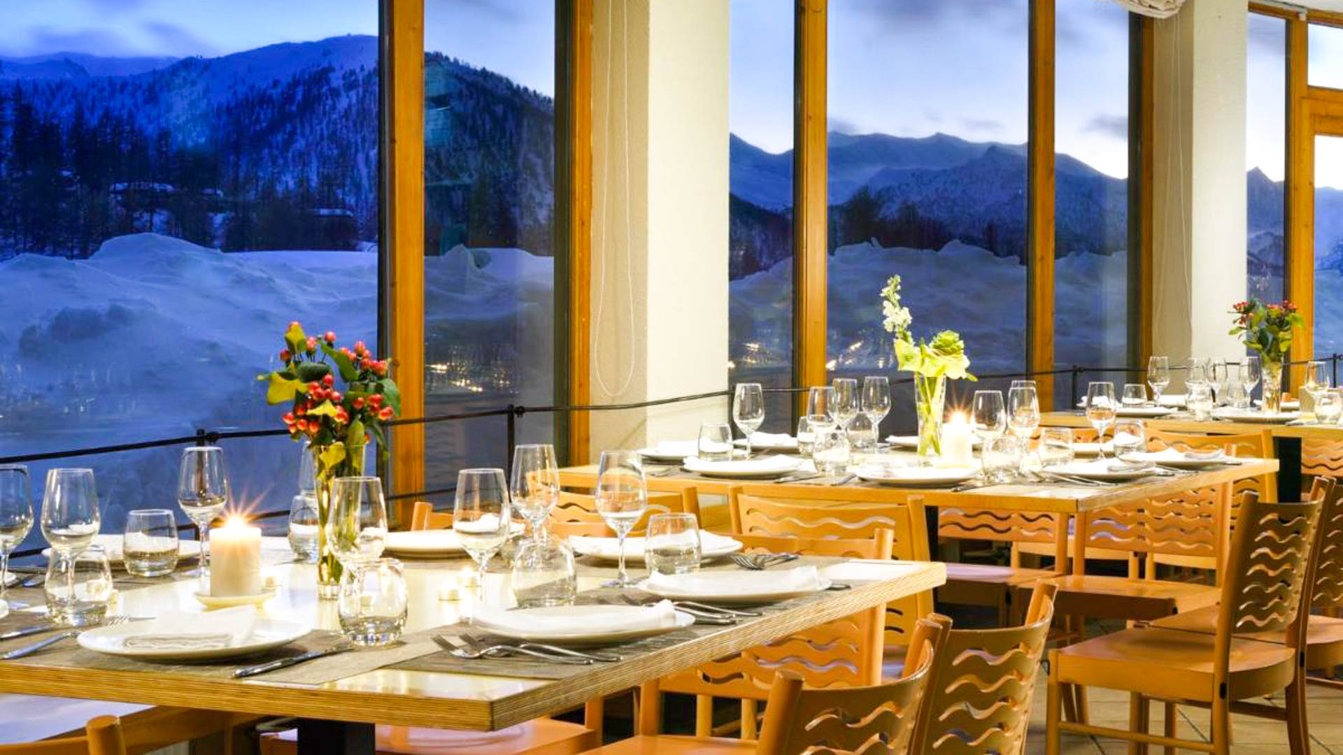 Il ristorante della struttura si trova in una sala panoramica che regala una vista spettacolare sulle piste da sci della Via Lattea. Il servizio è a buffet assistito e offre diverse opzioni di trattamento: